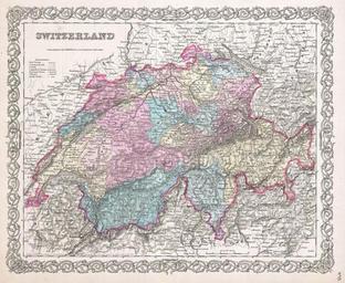 Keywords: 1855 Colton Map of Switzerland - Geographicus - Switzerland-colton-1855.jpg A beautiful 1855 first edition example of Colton's map of Switzerland Color coded according to canton Throughout Colton identifies various cities towns rivers and assortment of additional topographical details Surrounded by Colton's typical spiral motif border Dated and copyrighted to J H Colton 1855 Published from Colton's 172 William Street Office in New York City Issued as page no 15 in volume 1of the first edition of George Washington Colton's 1855 Atlas of the World 1855 dated Size in 16 5 13 object history credit line accession number Switzerland-colton-1855 Colton G W <i>Colton's Atlas of the World Illustrating Physical and Political Geography</i> Vol 2 New York 1855 First Edition Geographicus-source PD-old-100 Maps by Joseph Hutchins Colton Old maps of Switzerland 1855 maps
