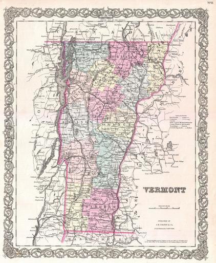 | Keywords: 1855 Colton Map of Vermont - Geographicus - Vermont-colton-1855.jpg A beautiful 1855 first edition example of Colton's map of Vermont Covers the entire state as well as adjacent parts of New Hampshire New York and Canada Like most of Colton's state maps this map is largely derived from an earlier wall map of North America produced by Colton and D Griffing Johnson Colton identifies various cities towns forts rivers rapids fords and an assortment of additional topographical details Map is hand colored in pink green yellow and blue pastels to define county and state boundaries Surrounded by Colton's typical spiral motif border Dated and copyrighted to J H Colton 1855 Published from Colton's 172 William Street Office in New York City Issued as page no 11 in volume 1 of the first edition of George Washington Colton's 1855 Atlas of the World 1855 dated Size in 13 16 object history credit line accession number Vermont-colton-1855 Colton G W <i>Colton's Atlas of the World Illustrating Physical and Political Geography</i> Vol 1 New York 1855 First Edition Geographicus-source PD-old-100 Maps by Joseph Hutchins Colton Old maps of Vermont 1855 maps |