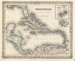 | Keywords: 1855 Colton Map of the West Indies - Geographicus - WestIndies-colton-1855.jpg A beautiful 1855 first edition example of Colton's map of the West Indies Centered on Santo Domingo Hispaniola this map extends north to include the to cover all of Florida south as far as Panama Bay and northern South America and east as far as Barbados and the Windward Islands Antilles Identifies the island of San Salvador or Cat Island in the Bahamas as the site where Columbus supposedly landed on October 12 of 1492 Colton also identifies the site off the southern shore of Santo Domingo where Sir John Duckworth defeated the remainder of the French fleet following the battle of Trafalgar Like most of Colton's North America maps this map is largely derived from an earlier wall map of North America produced by Colton and D Griffing Johnson Colton identifies various cities towns forts rivers rapids fords and an assortment of additional offshore and topographical details Map is hand colored in pink green yellow and blue pastels to define national and regional boundaries Surrounded by Colton's typical spiral motif border Dated and copyrighted to J H Colton 1855 Published from Colton's 172 William Street Office in New York City Issued as page no 56 in volume 1 of the first edition of George Washington Colton's 1855 Atlas of the World 1855 dated Size in 16 13 object history credit line accession number WestIndies-colton-1855 Colton G W <i>Colton's Atlas of the World Illustrating Physical and Political Geography</i> Vol 1 New York 1855 First Edition Geographicus-source PD-old-100 Maps by Joseph Hutchins Colton Old maps of the Caribbean 1855 maps |