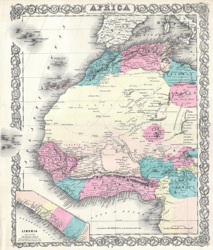 Keywords: 1855 Colton Map of Western Africa - Geographicus - AfricaW-c-55.jpg A beautiful 1855 first edition example of Colton's map of north western Africa Covers the entirety of north western Africa from Tripoli as far west as Senegal and Gambia and as far south as Gabon Inset map in the lower left depicts the Liberia land purchases from 1822 to 1848 Colton attempted to map the numerous caravan routes that crisscross the western Sahara noting wells oases towns mines and some topographical features The course of the Niger is shown somewhat correctly emptying into the Gulf of Guinea Names numerous African tribes and nations throughout Surrounded by Colton's typical spiral motif border Dated and copyrighted to J H Colton 1855 Published from Colton's 172 William Street Office in New York City Issued as page no 35 in volume 2 of the first edition of George Washington Colton's 1855 Atlas of the World 1855 dated Size in 16 13 5 object history credit line accession number AfricaW-c-55 Colton G W <i>Colton's Atlas of the World Illustrating Physical and Political Geography</i> Vol 2 New York 1855 First Edition Geographicus-source PD-old-100 Maps by Joseph Hutchins Colton Old maps of Africa |