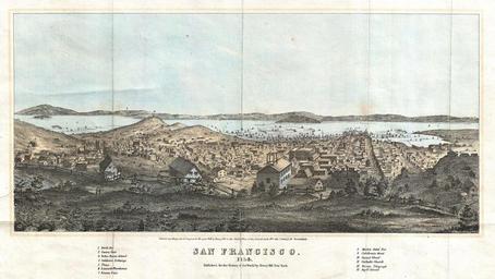 | Keywords: 1856 Henry Bill Map and View of San Francisco, California - Geographicus - SanFrancisco-bill-1856.jpg A highly appealing view map of San Francisco dating to 1856 Reveals San Francisco as seen from Nob Hill looking down California Street Telegraph Hill appears on the left Shows numerous buildings and ships throughout The most important buildings and locations are identified numerically These include North Bay Contra Costa Yerba Buena Island the California Exchange the Plaza Leanard ™s Warehouse Ricon Point the Market Street Pier California Street Central Warf the Catholic Church the Marine Telegraph and Anjill Island Published by Henry Bill for inclusion in the 1856 edition of his History of the World There are seven different printings of this view the earliest appearing in 1850 with subsequent editions in 1851 1852 1854 1855 1856 and 1857 Only the 1851 version appears to be from a different plate 1856 dated Size in 16 5 9 object history credit line accession number SanFrancisco-bill-1856 Maunder S <i>History of the World</i> Henry Bill New York 1856 Geographicus-source PD-art San Francisco in the 1850s |