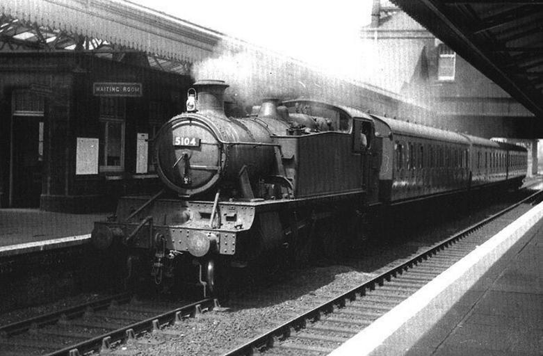 Keywords: train vehicle blackandwhite monochrome locomotive railroad steam engine road sport outdoor black and white Ex-GWR 2-6-2T No 5104, a class 51xx 'Large Prairie' locomotive, is seen entering Small Heath's up relief platform on a Snow Hill to Leamington local passenger service. Ex-GWR 2-6-2T No 5104, a class 51xx 'Large Prairie' locomotive, is seen entering Small Heath's up relief platform on a Snow Hill to Leamington local passenger service. |