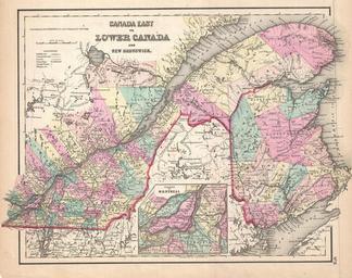 | Keywords: 1857 Colton Map of Quebec and New Brunswick, Canada - Geographicus - CanadaEast-colton-1857.jpg This is the uncommon 1857 issue of J H Colton ™s map of Quebec and New Brunswick At the time this region was referred to as Canada East or Lower Canada Covers lower Canada from Tadoussac in the North to the borders of Maine and Vermont in the south and from Huntingdon in the west to Westmoreland in the east Includes a detailed inset of the vicinity of Montreal Divided and color coded according to province and country Shows major roadways and railroads as well as geological features such as lakes and rivers Like most Colton maps this map is dated 1855 but most likely was issued in the 1857 issue of Colton ™s Atlas This was the only issue of Colton's Atlas that appeared without his trademark grillwork border Dated and copyrighted Entered according to the Act of Congress in the Year of 1855 by J H Colton Co in the Clerk ™s Office of the District Court of the United States for the Southern District of New York Published from Colton ™s 172 William Street Office in New York City NY 1859 dated 1855 Size in 16 5 14 object history credit line accession number CanadaEast-colton-1857 Colton G W <i>Colton's Atlas of the World Illustrating Physical and Political Geography</i> c 1857 edition Geographicus-source PD-old-100 Maps by Joseph Hutchins Colton Old maps of Quebec Old maps of New Brunswick Old maps of the Saint Lawrence River 1859 maps of Canada |
