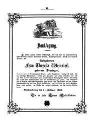 | Keywords: 1858-02-11 Danksagung Theresia Weinzierl (Beilage zum Ingolstädter Wochenblatt).png Theresia Weinzierl birth Theresia Deuringer ; 1775-1858 de Danksagung Theresia Weinzierl gebornen Deuringer Besitzerin des Oekonomiegutes Erlach Danksagung Theresia Weinzierl In Beilage zum Ingolstädter Wochenblatt vol 57 nro 7 1858 02 14 p 65<br />http //bavarica digitale-sammlungen de/de/fs1/object/display/bsb10345714_00071 html author <br /> Die in tiefer Trauer Hinterbliebenen Kind er Schwiegerkind er Enkel Urenkel 1858-02-14 PD-old Lorenz Weinzierl senior Ingolstädter Wochenblatt |