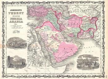 | Keywords: 1862 Johnson Map of Arabia, Persia and Turkey in Asia - Geographicus - Arabia-johnson-1862.jpg A very nice example of A J Johnson ™s 1862 map of Arabia Persia and Turkey in Asia Covers from the Mediterranean and Egypt eastwards as far as the Mouths of the Indus River as well as southward as far as the Horn of Africa and northwards to the Black Sea Depicts most of the politically volatile modern day middle east including the nations of Afghanistan Iraq Iran Saudi Arabia Jordan Israel Syria Lebanon and Turkey Offers color coding according to country and region as well as notations regarding desert caravan routes oases roadways river systems forts and monasteries and some topographical features Three inset views decorate the map Muscat lower left Trebisond lower left and the Castle and Port of Smyrna lower right Features the strapwork style border common to Johnson ™s atlas work from 1860 to 1863 Published by A J Johnson and Ward as plate number 89 in the 1862 edition of Johnson ™s New Illustrated Family Atlas This is the first edition of the Family Atlas to bear the Johnson and Ward imprint 1862 undated Size in 16 5 12 object history credit line accession number s Geographical Statistical and Historical </i> 1862 A J Johnson Ward edition Geographicus-source PD-old-100 Maps by Alvin Jewett Johnson 1862 maps Old maps of the Middle East |
