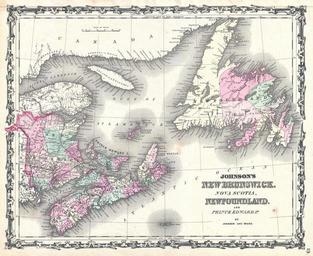| Keywords: 1862 Johnson Map of New Brunswick, Nova Scotia and Newfoundland, Canada - Geographicus - NewFoundland-johnson-1862.jpg A very beautiful example of Johnson's 1862 map of the Canadian provinces of New Brunswick Nova Scotia Prince Edward Island and Newfoundland Color coded according to county Shows railways lakes rivers and towns Features the strapwork style border common to Johnson ™s atlas work from 1860 to 1863 Published by A J Johnson and Ward as plate number 19 in the 1862 edition of Johnson ™s New Illustrated Family Atlas This is the first edition of the Family Atlas to bear the Johnson and Ward imprint 1862 undated Size in 16 13 object history credit line accession number s Geographical Statistical and Historical </i> 1862 A J Johnson Ward edition Geographicus-source PD-old-100 Maps by Alvin Jewett Johnson 1862 maps Old maps of Canada |