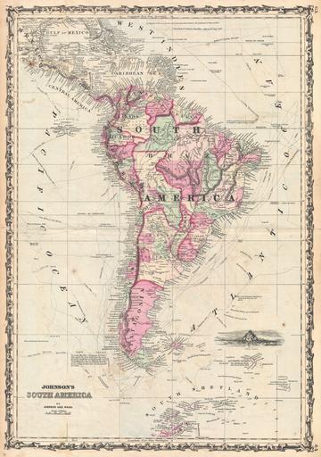 | Keywords: 1862 Johnson Map of South America - Geographicus - SouthAmer-johnson-1862.jpg A beautiful example of A J Johnson ™s 1862 map of South America This large and detailed map covers the continent from Mexico Florida and the Caribbean south to include South Shetland and parts of Antarctica Offers superb detail on the South American mainland with a noble attempt to map the great continental river systems Shows a vestigial though unlabeled remnant of the apocryphal Laguna de los Xarayes a supposed gateway to paradise and El Dorado at the northern terminus of the Rio Paraguay Names numerous indigenous groups many of which may or may not have existed In the surrounding seas Johnson notes the routes taken by numerous important explorers including Cook in 1768 Wallis in 1766 Carteret in 1766 the U S Ship Vincennes in 1838 Dr Halley in 1700 Columbus in 1493 the Spanish Sloop L'Atrevida in 1794 M Bougainville in 1768 Anson Capt George Powell in 1821 and others References some of the notes from these expeditions regarding the sighting of penguins whales sea birds and kelp Cartographically this map draws heavily on De L'Isle's important c 1730 map of South America We find in remarkable that in the course of over 130 years of exploration the interior of South America remained largely a mystery Exhibits the strapwork style border common to Johnson ™s atlas work from 1860 to 1863 Published by A J Johnson and Ward as page nos 63-64 in the 1862 edition of Johnson ™s New Illustrated Family Atlas This is the first edition of the Family Atlas to bear the Johnson and Ward imprint 1862 undated Size in 17 5 25 object history credit line accession number s Geographical Statistical and Historical </i> 1862 A J Johnson Ward edition Geographicus-source PD-old-100 Maps by Alvin Jewett Johnson 1862 maps Old maps of South America |