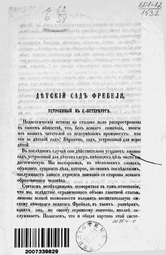 | Keywords: электронный ресурс ргб электронныйресурсргб ргб детский сад детскийсад история педагогики историяпедагогики фрёбель russian state library russianstatelibrary rsl blackandwhite monochrome text document writing black and white Белов, Иван Дмитриевич (1830-1886). Детский сад Фребеля, устроенный в С.-Петербурге / [И. Белов]. - [Санкт-Петербург] : Воен. тип., ценз. 1863. - 7 с.; 23. Авт. указан в конце текста Без тит. л. и обл. search.rsl.ru/ru/record/01003575641 Белов, Иван Дмитриевич (1830-1886). Детский сад Фребеля, устроенный в С.-Петербурге / [И. Белов]. - [Санкт-Петербург] : Воен. тип., ценз. 1863. - 7 с.; 23. Авт. указан в конце текста Без тит. л. и обл. search.rsl.ru/ru/record/01003575641 |