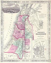 | Keywords: 1864 Johnson Map of Israel, Palestine, or the Holy Land - Geographicus - Palestine-j-64.jpg This is a beautiful hand colored map of Israel Palestine or the Holy Land Map details cities roads biblical and historical sites with color coding at the regional level Where appropriate alternate place names taken from the Arabic are noted Topography shown by hachure An inset map of Jerusalem appears in the lower right quadrant with all principal buildings noted The upper left quadrant features an engraved view of Damascus Features the fretwork style border common to Johnson ™s atlas work from 1864 to 1869 Published by A J Johnson and Ward as plate no 93 in the 1864 edition of Johnson ™s New Illustrated Family Atlas This is the first edition of the Johnson ™s Atlas to bear the Johnson Ward imprint and the only edition to identify the firm as the Successors to Johnson and Browning Successors to J H Colton and Company 1864 undated Size in 17 13 object history credit line accession number s Geographical Statistical and Historic including The Latest Federal Census A Geographical Index and a Chronological History of the Civil War in America</i> first Johnson and Ward 1864 Geographicus-source PD-old-100 Maps by Alvin Jewett Johnson 1864 maps Old maps of Israel Old maps of Palestine Old maps of Jordan Old maps of the Holy Land |