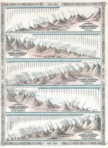 Keywords: 1864 Johnson's World Mountains and Rivers Map or Chart - Geographicus - MtsRvrs-johnson-1864.jpg This is the 1864 edition of Johnson's Mountains and Rivers Chart This chart printed in 1864 represents a significant reimagining and re-engraving of Johnson's pre-1864 mountains and rivers charts Johnson first introduced a mountains and rivers chart in the second edition of his atlas published in 1861 That chart based on a related 1855 chart engraved by J H Colton was very similar to other topical charts common in European atlases of the period in that it presented all of the great mountains and rivers of the world in a single panoramic view Johnson perhaps recognizing that the traditional chart which necessarily highlighted the primacy of the great mountains and rivers of Asia was difficult to read with regard to the regions that interested his constituent readers - North Americans and Europeans Thus Johnson re-engraved his chart taking the bold step of dividing the world's great mountains and rivers by continent This curious move made the map more accessible on a continental level Johnson's 1864 mountains and rivers chart can also be read from a political perspective for by dividing the mountains according to continents each continent's mountains appear equally great While Johnson is not the first to focus his mountains and rivers chart on particular continent this is the first example we are aware of that consolidate the mountains and rivers all of the continents each represented individually on a single chart The chart is ordered roughly alphabetically in five sections with Africa at the top followed by Asia Europe South America and North America Curiously Johnson chooses to place North America below South America - a clear break his is alphabetical sequence This unusual move is possibly in deference to the perceived greater importance of North America relative to its southerly cousin In the Africa section Kilimanjaro is identified as the highest mountain and the Nile its longest river This chart also includes the Great Pyramid In the Asia second Everest at 29 000 feet is recognized as the highest mountain and the Yangtze as the longest river In the Europe section the highest mountain is Mont Blanc and the Volga is recognized as the longest River IN South America Tupungato Tupungata at 22 450 feet is identified as the highest mountain Aconcagua is a sad no 2 and the Amazon is the greatest River North America still not fully explored when this map was published lists Mt St Elias of the Canadian Yukon as the highest mountain followed by the Popocatepetl and Orizaba volcanoes of Mexico This is in fact somewhat reversed from actuality with Orizaba being the highest at 18 504 feet followed by Elias at 18 009 feet and Popocatepetl at 17 930 At this time neither Mount McKinley Denali nor Mount Logan the true highest peaks of North America had been measured Even so Johnson does correctly recognized the Mississippi as the continent's longest river Published by A J Johnson as plate nos 2-3 for issue in the 1864 edition of Johnson's Family Atlas Dated an copyrighted 1864 1864 dated Size in 17 25 23 25 object history credit line accession number MtsRvrs-johnson-1864 <i>Johnson's New Illustrated Steel Plate Family Atlas</i> 1864 edition Geographicus-source PD-old-100 Alvin Jewett Johnson Maps of mountains Old maps of rivers Geographic comparison diagrams Diagrams of Popocatépetl |