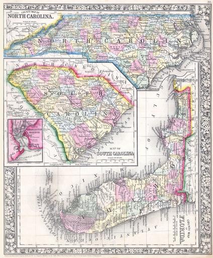 Keywords: 1864 Mitchell Map of North Carolina, South Carolina and Florida - Geographicus - NCSCFL-mitchell-1864.jpg A beautiful example of S A Mitchell Jr ™s 1864 map of North Carolina South Carolina and Florida Detailed to the county level with special attention both political and geographic elements Notes important river systems railways canals and cities An inset in the center left features the city and harbor of Charleston South Carolina Though the copyright information in unchanged this map was updated from the 1860 variant to include North Carolina One of the most attractive American atlas maps of this region to appear in the mid 19th century Features the floral border typical of Mitchell maps from the 1860-65 period Prepared by S A Mitchell for inclusion as plate no 30 in the 1864 issue of Mitchell ™s New General Atlas Dated and copyrighted Entered according to Act of Congress in the Year 1860 by S Augustus Mitchell in the Clerk ™s Office of the District Court of the U S for the Eastern District of Pennsylvania 1860 dated Size in 11 5 14 25 object history credit line accession number NCSCFL-mitchell-1864 <i>Mitchell's New General Atlas containing Maps of the Various Countries of the World Plans of Cities Etc Embraced in Fifty-three Quarto Maps forming a series of Eighty-Four Map and Plans together with Valuable Statistical Tables </i> 1864 Edition Geographicus-source PD-old-100 1864 maps Old maps of Florida Old maps of North Carolina Old maps of South Carolina 1864 in Florida 1864 in North Carolina 1864 in South Carolina Maps by Samuel Augustus Mitchell |