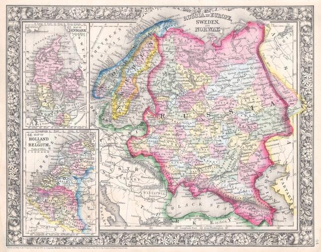 Keywords: 1864 Mitchell Map of Russia, Scandinavia, Denmark, Holland and Belgium - Geographicus - Russia-mitchell-1864.jpg A beautiful example of S A Mitchell Jr ™s 1864 map of Russia Norway Sweden Holland Belgium and Denmark Maps of Denmark Holland and Belgium relegated in insets on the left hand side of the map Denotes both political and geographical details Extends as far south and west as the boot of Italy and as far east as the Caspian Sea and the Gulf of Obi One of the most attractive American atlas maps of this region to appear in the mid 19th century Features the floral border typical of Mitchell maps from the 1860-65 period Prepared by S A Mitchell for inclusion as plate no 64 in the 1864 issue of Mitchell ™s New General Atlas Dated and copyrighted Entered according to Act of Congress in the Year 1860 by S Augustus Mitchell in the Clerk ™s Office of the District Court of the U S for the Eastern District of Pennsylvania 1860 dated Size in 13 75 11 object history credit line accession number Russia-mitchell-1864 <i>Mitchell's New General Atlas containing Maps of the Various Countries of the World Plans of Cities Etc Embraced in Fifty-three Quarto Maps forming a series of Eighty-Four Map and Plans together with Valuable Statistical Tables </i> 1864 Edition Geographicus-source PD-old-100 Maps by Samuel Augustus Mitchell Old maps of the Russian Empire Old maps of Scandinavia Old maps of Denmark Old maps of the Netherlands Old maps of Belgium 1860 maps |