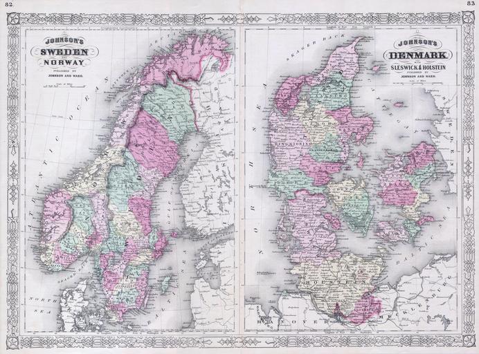 | Keywords: 1865 Johnson Map of Sweden, Norway and Denmark - Geographicus - SwedenDenmark-j-65.jpg This is a magnificent 1865 hand colored map Scandinavia is divided into two parts The left map represents Norway and Sweden The right map depicts Denmark as well as the provinces of Sleswick Holstein Depicts the area in considerable detail including both political and physical geographic features Map is dated and copyrighted Entered according to Act of Congress in the Year of 1865 by A J Johnson in the Clerk ™s Office of the District Court of the United States for the Southern District of New York 1865 Size in 24 17 object history credit line accession number SwedenDenmark-j-65 Geographicus-source PD-old-100 Maps by Alvin Jewett Johnson 1865 maps Old maps of Denmark Old maps of Norway Old maps of Sweden |