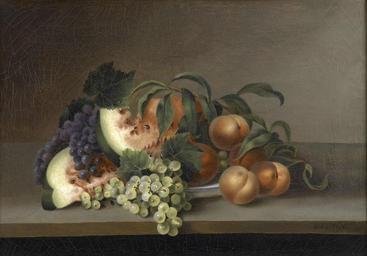 | Keywords: 1865, Peale, Rubens, Still Life with Watermelon.jpg en Rubens Peale American 1784 “1865 Still Life with Watermelon 1865 Oil on canvas 48 3 x 69 9 cm 19 x 27 1/2 in frame 66 5 × 87 × 8 5 cm 26 3/16 × 34 1/4 × 3 3/8 in Gift in honor of Professor John Wilmerding from his friends and former students and the Kathleen C Sherrerd Fund for Acquisitions in American Art 2007-20 Among American painter Charles Willson Peale ™s many artistic children Rubens Peale was a late bloomer His poor eyesight meant he did not receive his father ™s instruction in painting but instead was groomed to manage Peale ™s Museum the public display of art and natural history Charles Willson began to develop during Rubens ™s youth It was not until the age of seventy-one that Peale was taught to paint … ” …by his daughter Mary Still Life with Watermelon completed during Rubens ™s eighty-first year offers eloquent testimony that he ended his brief career at the peak of his powers A finely balanced completely assured example of the artist ™s numerically modest oeuvre the painting partakes of the quiet simplicity of his brother Raphaelle ™s frieze-like Neoclassical compositions executed decades earlier and relates as well to his uncle James Peale ™s horizontal tabletop arrangements of indirectly illuminated fruit including the pictorial device of a piece of fruit shown overhanging the table ™s edge relieving its insistent planarity 1865 Princeton University Art Museum Rubens Peale other versions PD-Art Uploaded with UploadWizard American art in the Princeton University Art Museum American paintings in the Princeton University Art Museum Still life paintings in the Princeton University Art Museum Paintings in the Princeton University Art Museum Rubens Peale 19th-century still life paintings of fruits Taken with Phase One P45 |