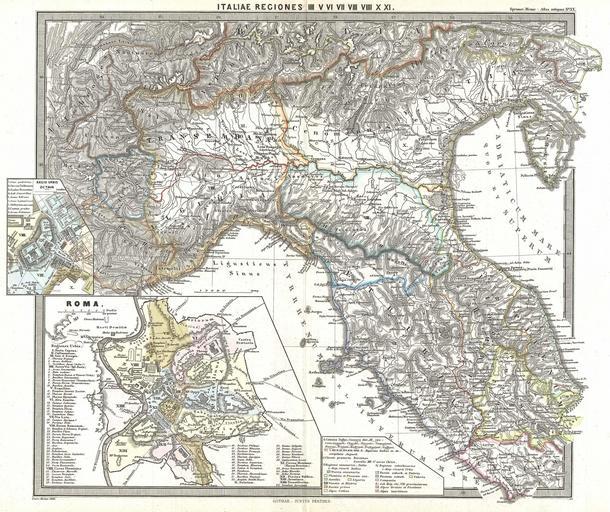 | Keywords: 1865 Spruner Map of Northern Italy in Antiquity - Geographicus - ItaliaeIIII-spruner-1865.jpg A particularly interesting map this is Karl von Spruner ™s 1865 rendering of Northern Italy and Rome in antiquity This map covers northern Italy from modern day Venetia south as far as Rome and west to modern day Piedmont Like most of Spruner ™s work this example overlays ancient political geographies on relatively contemporary physical geographies thus identifying the sites of forgotten towns and villages the movements of armies and the disposition of lands in the region This particular example includes ancient names for many important regions and sites Additionally two inset maps are offered in the lower left quadrant The larger of the two insets is a city plan of Rome including the ancient city walls and an elaborate key identifying some 62 historic sites The smaller of the two insets details the Palace of Octavius Region Urbis Octava As a whole the map labels important cities rivers mountain ranges and other minor topographical detail Territories and countries outlined in color The whole is rendered in finely engraved detail exhibiting the fine craftsmanship for which the Perthes firm is known 1865 undated Size in 16 13 object history credit line accession number ItaliaeIIII-spruner-1865 Spruner Karl von <i>Spruner-Menke Atlas Antiquus </i> Gotha Justus Perthes 1865 Geographicus-source PD-old-100 Karl Spruner von Merz Old maps of Italy Maps of ancient Italy Old maps of ancient Rome city 1865 |