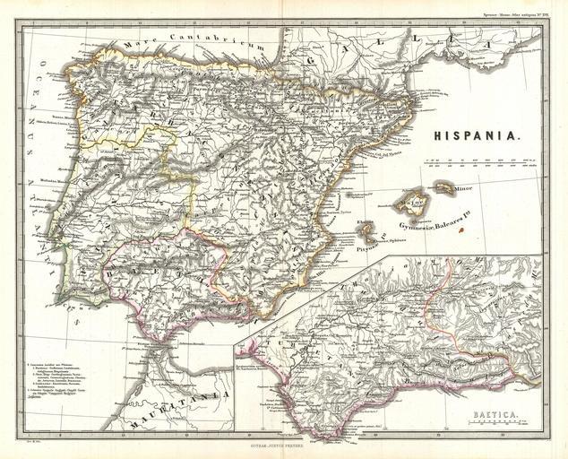 Keywords: 1865 Spruner Map of Spain and Portugal - Geographicus - Hispania-spruner-1865.jpg This is Karl von Spruner ™s 1865 map of Hispania modern day Spain and Portugal Under the Roman Republic Hispania or Iberia was divided into two provinces Hispania Citerior and Hispania Ulterior “both of which are noted here Later during the Roman Principate Hispania Ulterior was divided into two new provinces Baetica and Lusitania while Hispania Citerior was renamed Tarraconensis which is illustrated on this map Spruner also includes a detailed inset showing Hispania Baetica modern day AndalucÃa one of three Imperial Roman provinces in Hispania modern Iberia Hispania Baetica was bordered to the west by Lusitania and to the northeast by Hispania Tarraconensis Shows names of ancient tribes and peoples and the areas they inhabited Map includes a scale and a legend in the upper-left quadrant Map notes important cities rivers mountain ranges and other minor topographical detail Territories and countries outlined in color The whole is rendered in finely engraved detail exhibiting throughout the fine craftsmanship of the Perthes firm 1865 undated Size in 16 13 object history credit line accession number Hispania-spruner-1865 Spruner Karl von <i>Spruner-Menke Atlas Antiquus </i> Gotha Justus Perthes 1865 Geographicus-source PD-old-100 Karl Spruner von Merz Old maps of Spain Old maps of Portugal 1865 maps |
