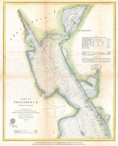 Keywords: 1865 U.S. Coast Survey Map or Chart of Providence, Rhode Island - Geographicus - ProvidencePort-uscs-1865.jpg An attractive example of the 1865 U S Coast Survey map or nautical chart of the Port of Providence Covers part of Narragansett Bay from Starvegoat Island north to Providence and the mouth of the Seekonk River Today Starvegoat Island and the adjacent Oyster Beds have been filled in by a c 1950s land reclamation project Offers a wealth of practical information for the navigator ranging from depth soundings to notes on tides lighthouses and shoals The hand color work on this beautiful map is exceptionally well done The triangulation for this chart was accomplished by E Blunt The Topography is the work of A M Harrison The Hydrography was completed by a party under the command of F P Webber Compiled under the direction of A D Bache Superintendent of the Survey of the Coast of the United States and one of the most influential American cartographers of the 19th century 1865 dated Size in 15 5 19 5 object history credit line accession number ProvidencePort-uscs-1865 <i>Report of the Superintendant of the United States Coast Survey </i> Washington 1865 edition Geographicus-source PD-art United States Coast Survey maps Old maps of Rhode Island |