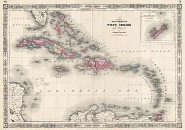 | Keywords: 1866 Johnson Map of the West Indies and Caribbean - Geographicus - WestIndies-johnson-1866.jpg A beautiful example of A J Johnson ™s 1866 map of the West Indies Covers from Florida to Venezuela and from Honduras to Barbados Includes the Bahamas Cuba Jamaica Santo Domingo Hispaniola Porto Rico and the Lesser Antilles or Windward Isles An inset of Bermuda appears in the upper right quadrant Features some offshore detail with depth soundings in the Pedro Bank off Jamaica off the coast of Nicaragua and in the Bahama Bank Larger islands feature color coding according to district Throughout Johnson identifies various cities towns rivers and assortment of additional topographical details Features the fretwork style border common to Johnson ™s atlas work from 1864 to 1869 Published by A J Johnson and Ward as plate numbers 70 and 71 in the 1866 edition of Johnson ™s New Illustrated Family Atlas 1866 dated 1864 Size in 23 5 17 5 object history credit line accession number s Geographical Statistical and Historic including The Latest Federal Census A Geographical Index and a Chronological History of the Civil War in America</i> 1866 Geographicus-source PD-old-100 Maps by Alvin Jewett Johnson 1866 maps Old maps of the Caribbean Caribbean in the 1860s |