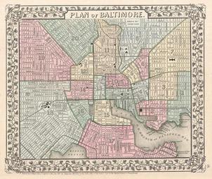 | Keywords: 1867 Mitchell Map of Baltimore, Maryland - Geographicus - Baltimore-mitchell-1867.jpg A beautiful example of S A Mitchell Jr ™s 1867 map of Baltimore Maryland Covers Baltimore from the Northwest Brach of the Patapsco River and Locust Point northwards as far as Green Mountain Cemetary and Oliver Street Hand colored in pink green yellow and blue pastels to identify city wards In general this map offers extraordinary detail at level of individual streets and buildings Identifies the city Hospital Railroad Depot Mt Clare Station St Mary's College and the City Jail among many other sites Surrounded by the attractive vine motif border common to Mitchell atlases between 1866 and 1880 One of the more attractive atlas maps of Baltimore to appear in the latter half of the 19th century Prepared by S A Mitchell Jr for inclusion as plate no 28 in the 1867 issue of Mitchell ™s New General Atlas Dated and copyrighted Entered according to Act of Congress in the Year 1867 by S Augustus Mitchell Jr in the Clerks Office of the District Court for the Eastern District of Pennsylvania 1867 dated Size in 11 5 10 object history credit line accession number Baltimore-mitchell-1867 Mitchell Jr S A <i>Mitchell's new general atlas containing maps of the various countries of the World plans of cities etc </i> 1867 edition Geographicus-source PD-old-100 Maps by Samuel Augustus Mitchell Old maps of Baltimore 1867 maps |