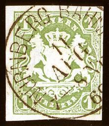 | Keywords: 1868 Bayern 1kr Mi14a.jpg en Stamp of Bavaria 1 kreuzer issue 1867 yellow-green typo cancelled Nà RNBERG BAHNHOF on 11-08-1868 Michel N°14a 1868 scan 2014-06-06 21 25 08 own Jacquesverlaeken Scan of a cancelled stamp > 100 years old Design by J P Riess cc-zero 1867 stamps of Bavaria Postmarks of Bavaria Uploaded with UploadWizard Nuremberg in the 1860s |