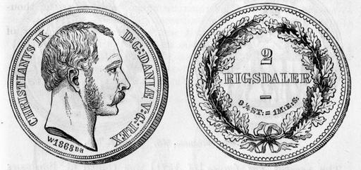| Keywords: 1868 Danish 2 rigsdaler both.png A Danish silver two rigsdaler piece of 1868 with the head of Christian IX Weight 927 fineness 877 Value 4s 3/8d Both sides shown CHRISTIANVS IX D G DANIÆ V G REX Bare head right In ex W 1868 B ¢H Note the engraving show B ¢H but on the coin there is R ¢H the initials of Rasmus Hinnerup mint-master of Copenhagen mint 1891-1869 Oak wreath In field 2 // RIGSDALER in two lines Below 9 ¼ ST 1 M E S i e 9 ¼ pieces 1 Cologne mark KM 772 Engraving from the article Recent Coinage of the World in the Companion to the British Almanac of 1874 1874 Name of coin designer or engraver not known PD-old Obverse only Reverse only Coins of Denmark 1868 1868 coins Christian IX of Denmark on coins Daler |