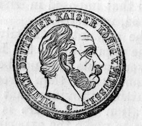 | Keywords: 1868 German 20 marks obverse.png A German gold 20 mark piece of 1868 with the head of William Weight 256 fineness 900 Value 5 francs less than the British sovereign so about 16s Obverse shown Engraving from the article Recent Coinage of the World in the Companion to the British Almanac of 1874 1874 Name of coin designer or engraver not known PD-old Coins of Prussia 1872 1872 coins | ||||