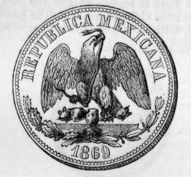 | Keywords: 1869 Mexican peso obverse.png A Mexican silver peso of 1869 Weight 867 5 fineness 903 Value 4s 4 5/8d Obverse shown Engraving from the article Recent Coinage of the World in the Companion to the British Almanac of 1874 1874 Name of coin designer or engraver not known PD-old Coins of Mexico 1869 coins |