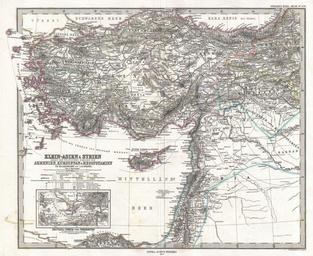 | Keywords: 1873 Stieler Map of Asia Minor, Syria and Israel - Palestine (modern Turkey) - Geographicus - Klein-AsienSyrien-stieler-1873.jpg This is a beautiful example of Stieler ™s 1873 map of the modern day Turkey Syria Israel / Palestine and Cyprus Highly detailed with both political and physical data Shows cities mountains roads rivers and local divisions An inset in the lower left quadrant features the vicinity of Smyrna modern Ismir including depth sounding in the Gulf of Smyrna and harbor Printed to a high production standard as was typical of German and especially Perthes/Stieler maps of this period Published by the Justus Perthes firm and engraved by F Eulenstein and C Jungmann for issue as plate no 43 in the 1873 edition of Stieler ™s Hand-Atlas 1873 dated Size in 16 6 13 5 object history credit line accession number Klein-AsienSyrien-stieler-1873 <i>Stieler's Hand-Atlas</i> 1873 issue Geographicus-source PD-old-100 Old maps of the Middle East Old maps of Israel Old maps of Palestine Old maps of Syria Old maps of Turkey 1873 maps |