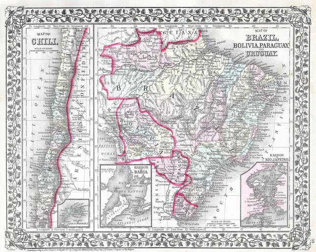 Keywords: 1874 Mitchell Map of South America, Brazil, Bolivia, Papaguay, Uruguay and Chili. - Geographicus - Brazil-m-1874.jpg This hand colored map is a lithographic engraving dating to 1874 by the legendary American Mapmaker S A Mitchell the younger It represents the South American nations of Chili Brazil Brasil Paraguay Bolivia and Uruguay There are inset maps of Rio de Janerio the Harbor of Bahia and the Island of Juan Fernandez Robinson Crusoe Island Bolivia at this time extended to the Pacific Coast 1874 Size in 14 11 object history credit line accession number Brazil-m-1874 Geographicus-source PD-old-100 Maps by Samuel Augustus Mitchell Old maps of Brazil Old maps of Bolivia Old maps of Paraguay Old maps of Uruguay Old maps of Chile 1874 maps Maps of Empire of Brazil |