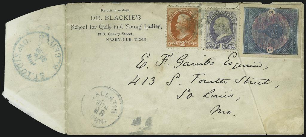 Keywords: 1877 Buffalo balloon cover.png en Cover flown on June 18 1877 Buffalo balloon flight from Nashville to Gallatin Tennessee One of three covers recorded 5-cent Buffalo balloon airmail label affixed with additional 3-cents of postage stamps to pay for delivery to final destination; St Louis MO <br>Hammer price realised was US 415 000 author http //www robertasiegelauctiongalleries org/2004/874/58 jpg Image file page was sourced from http //www robertasiegelauctiongalleries org/2004/874/y8748 htm Robert A Siegel Auction Galleries auction of The Jeanette C Rudy Collection of Tennessee Postal History auction Tuesday April 27 2004 1877 PD-old 1877 stamps Airmail covers Transport of post by aircraft Philatelic uploads by Ww2censor United States Gallatin Tennessee 1877 postmarks |