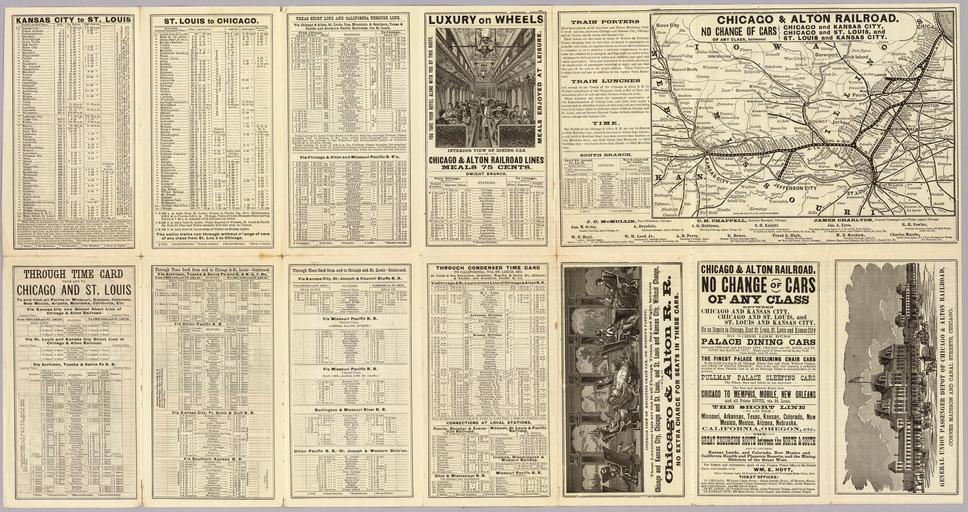 | Keywords: 1884 Chicago & Alton.jpg 1884 timetable and map of the Chicago and Alton Railroad Chicago and Alton Railroad Cartography Associates San Francisco CA http //www davidrumsey com David Rumsey Map Collection 1884 See also File 1884 Chicago Alton text jpg and File 1884 Chicago Alton map only jpg PD-old Alton Railroad Old railroad maps of the United States David Rumsey Historical Map Collection Train timetables in the United States | ||||
