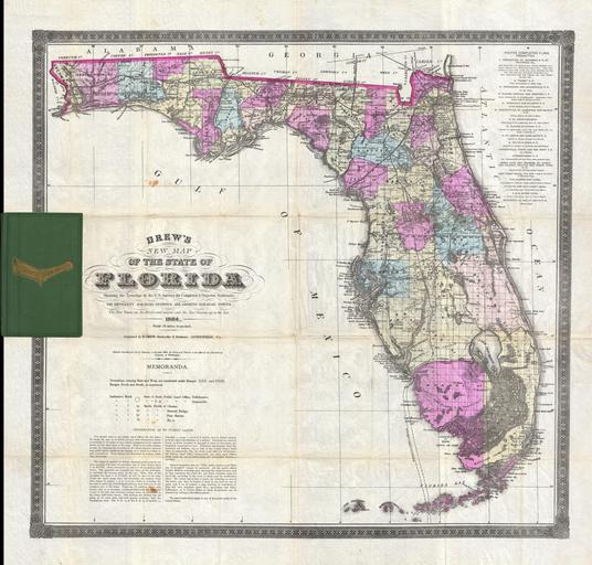 | Keywords: 1884 Drew Pocket Map of Florida - Geographicus - Florida-drew-1884.jpg An extremely scarce and important map of Florida drawn by Horace Drew in 1884 This highly uncommon map the earliest known example of which was issued in 1867 is considered to be the only pocket map of Florida actually printed in Florida The first edition of this map was printed by Columbus Drew from his offices in Jacksonville Florida and subsequently updated in an unknown number of editions into the 1880s This example was printed by Horace Drew son and successor to Columbus It reflects the rapid and hopeful development of Florida through the middle and late 19 century with numerous railways roads and canals noted Of particular note is the Lucie Canal shown here leading from Lake Okeechobee to the Atlantic This canal was part of a plan supported by Drew to drain the Everglades via a series of well placed water channels Fortunately the Lucie canal was never built and the unique Everglades biosphere has been preserved for us to enjoy today Also of interest is the extensive notation in the lower left quadrant regarding the Florida Land Survey Even in the late 19th century much of Florida remained federally administrated Public Land It was the work of the Florida Land Survey upon which this map is based to plat out the land for sale to settlers Drew's notations explain the process and how do identify land available for purchase Drew additionally notes the sites of various important battles during the Seminole Wars Considered the Holy Grail of 19th century Florida cartography this map is a must for any serious collection focusing on the American Southeast Dated and copyrighted Entered according to Act of Congress in the year 1884 by Horace Drew in the office of the Librarian of Congress at Washington 1884 dated Size in 26 25 object history credit line accession number Florida-drew-1884 Geographicus-source PD-art Old maps of Florida 1884 maps |