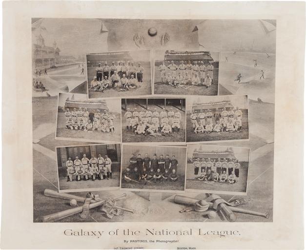 | Keywords: 1888 Galaxy of the National League.jpg 1888 Galaxy of the National League Lithograph by G H Hastings Rare nineteenth century features a photo montage of eight National League baseball teams Washington Nationals Pittsburgh Alleghenys New York Giants Boston Beaneaters Indianapolis Hoosiers Chicago White Stockings Philadelphia Phillies and Detroit Wolverines Hall of Famers that are depicted include Cap Anson Sam Thompson Deacon White Harry Wright Mickey Welch Jim O'Rourke Montgomery Ward Buck Ewing Tim Keefe Roger Connor and Pud Galvin http //sports ha com/itm/baseball/1888-galaxy-of-the-national-league-lithograph-by-gh-hastings/a/7123-81898 s Heritage Auctions 1888 G H Hastings 147 Tremont Street Boston Mass PD-old 1888 Chicago White Stockings season Washington Nationals 1886 “89 New York Giants baseball Boston Braves Philadelphia Phillies Detroit Wolverines |