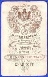 | Keywords: Федецкий Альфред 1890 Портр.дев. B.jpg ru Эмблема фотог афического ателье Альф еда Федецкого в Ха ькове на обо отной сто оне фото own scan Alfred Fedetsky's Studio между 1888 дата на медали - 1899 <gallery>File Федецкий Альф ед 1890 По т ет девушки A jpg</gallery> PD-old-100 PD-RusEmpire Alfred Fedetsky Logos Alexandra Petrovna of Oldenburg |