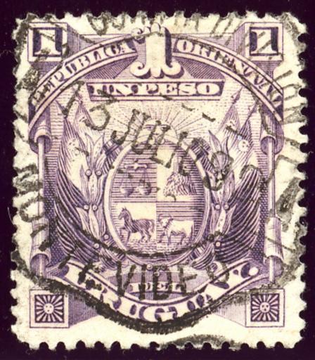 | Keywords: 1890 Uruguay 1P Mi80.jpg en Stamp of Uruguay 1 Peso issue 1890 violet cancelled MONTEVIDEO 13 JULIO 92 Michel N°80 2014-04-28 00 26 03 own Jacquesverlaeken Scan of a stamp with interesting cancellation > 100 years old cc-zero Stamps of Uruguay 1890 Postmarks of Uruguay Coats of arms of Uruguay on stamps Stamps printed by Waterlow |
