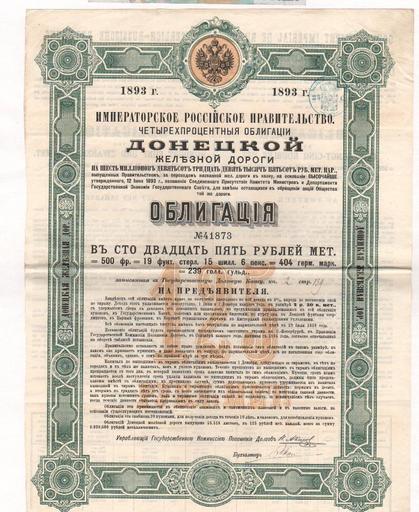 | View Original: | 1893. Донецкая железная дорога. Облигация в 125 рублей металлом.jpg (786x960) | |||