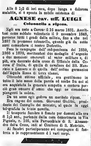 | Keywords: 1893-08-16-Luigi-Agnesi-necrologio.jpg it Necrologio del Cav Uff Luigi Agnese 1831-1893 colonello in pensione cugino del presidente del Consiglio Giovanni Giolitti morto il 15 8 1893 a Bergamo Gazzetta provinciale di Bergamo 16 8 1893 Gazzetta provinciale di Bergamo 1893-08-16 PD-old Obituaries of Italy Luigi Agnese Giovanni Giolitti 1893 obituaries of Italy Culture of Bergamo | ||||