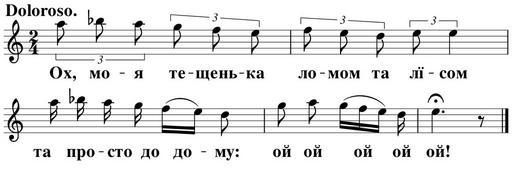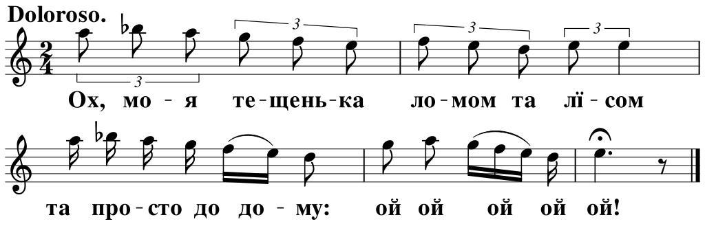 | Keywords: Зоря. Ноти. 1894. 08. V. Теща.2.svg uk Ілюст ація до статті иколи Лисенка а одні музичні ст ументи на Вк аїнї оти пісні Теща 1894-04-27 Зо я часопис 1894 08 с 187 икола Лисенко other versions Часопис Зо я 1894 08 pdf Hidden background ECECEC; white;color black border 1px grey solid; padding 2px Created by MuseScore <nowiki> < xml version 1 0 encoding UTF-8 > <museScore version 2 06 > <programVersion>2 0 2</programVersion> <programRevision>f51dc11</programRevision> <Score> <LayerTag id 0 tag default ></LayerTag> <currentLayer>0</currentLayer> <Synthesizer> </Synthesizer> <Division>480</Division> <Style> <staffUpperBorder>5</staffUpperBorder> <TextStyle> <halign>center</halign> <valign>baseline</valign> <xoffset>0</xoffset> <yoffset>6</yoffset> <offsetType>spatium</offsetType> <name>Lyrics Odd Lines</name> <family>FreeSerif</family> <size>14</size> <bold>1</bold> <sizeIsSpatiumDependent>1</sizeIsSpatiumDependent> </TextStyle> <TextStyle> <halign>left</halign> <valign>baseline</valign> <xoffset>0</xoffset> <yoffset>-4</yoffset> <offsetType>spatium</offsetType> <name>Tempo</name> <family>FreeSerif</family> <size>14</size> <bold>1</bold> <sizeIsSpatiumDependent>1</sizeIsSpatiumDependent> <systemFlag>1</systemFlag> </TextStyle> <page-layout> <page-height>300 472</page-height> <page-width>850 394</page-width> <page-margins type even > <left-margin>5 66929</left-margin> <right-margin>5 66929</right-margin> <top-margin>56 6929</top-margin> <bottom-margin>113 386</bottom-margin> </page-margins> <page-margins type odd > <left-margin>5 66929</left-margin> <right-margin>5 66929</right-margin> <top-margin>0</top-margin> <bottom-margin>0</bottom-margin> </page-margins> </page-layout> <Spatium>1 764</Spatium> </Style> <showInvisible>1</showInvisible> <showUnprintable>1</showUnprintable> <showFrames>1</showFrames> <showMargins>0</showMargins> <metaTag name arranger ></metaTag> <metaTag name composer ></metaTag> <metaTag name copyright ></metaTag> <metaTag name creationDate >2015-11-23</metaTag> <metaTag name lyricist ></metaTag> <metaTag name movementNumber ></metaTag> <metaTag name movementTitle ></metaTag> <metaTag name platform >Microsoft Windows</metaTag> <metaTag name poet ></metaTag> <metaTag name source ></metaTag> <metaTag name translator ></metaTag> <metaTag name workNumber ></metaTag> <metaTag name workTitle ></metaTag> <PageList> <Page> <System> </System> <System> </System> </Page> </PageList> <Part> <Staff id 1 > <StaffType group pitched > <name>stdNormal</name> </StaffType> <bracket type -1 span 0 /> </Staff> <trackName>Violin</trackName> <Instrument> <longName>Violin</longName> <shortName>Vln </shortName> <trackName>Violin</trackName> <minPitchP>55</minPitchP> <maxPitchP>103</maxPitchP> <minPitchA>55</minPitchA> <maxPitchA>88</maxPitchA> <instrumentId>strings violin</instrumentId> <Articulation> <velocity>100</velocity> <gateTime>100</gateTime> </Articulation> <Articulation name staccatissimo > <velocity>100</velocity> <gateTime>33</gateTime> </Articulation> <Articulation name staccato > <velocity>100</velocity> <gateTime>50</gateTime> </Articulation> <Articulation name portato > <velocity>100</velocity> <gateTime>67</gateTime> </Articulation> <Articulation name tenuto > <velocity>100</velocity> <gateTime>100</gateTime> </Articulation> <Articulation name marcato > <velocity>120</velocity> <gateTime>67</gateTime> </Articulation> <Articulation name sforzato > <velocity>120</velocity> <gateTime>100</gateTime> </Articulation> <Channel> <program value 40 /> <synti>Fluid</synti> </Channel> <Channel name pizzicato > <program value 45 /> <synti>Fluid</synti> </Channel> <Channel name tremolo > <program value 44 /> <synti>Fluid</synti> </Channel> </Instrument> </Part> <Staff id 1 > <Measure number 1 > <KeySig> <accidental>0</accidental> </KeySig> <TimeSig> <sigN>2</sigN> <sigD>4</sigD> <showCourtesySig>1</showCourtesySig> </TimeSig> <Tempo> <tempo>2</tempo> <pos x -8 60662 y -2 34994 /> <text>Doloroso </text> </Tempo> <Tuplet id 1 > <pos x 0 299981 y -0 299981 /> <normalNotes>2</normalNotes> <actualNotes>3</actualNotes> <baseNote>eighth</baseNote> <Number> <style>Tuplet</style> <text>3</text> </Number> <offset x 0 299981 y -0 299981 /> </Tuplet> <Chord> <Tuplet>1</Tuplet> <durationType>eighth</durationType> <Lyrics> <text>Ох </text> </Lyrics> <Note> <pitch>81</pitch> <tpc>17</tpc> </Note> </Chord> <Chord> <Tuplet>1</Tuplet> <BeamMode>no</BeamMode> <durationType>eighth</durationType> <Lyrics> <syllabic>begin</syllabic> <text>мо</text> </Lyrics> <Note> <Accidental> <subtype>flat</subtype> </Accidental> <pitch>82</pitch> <tpc>12</tpc> </Note> </Chord> <Chord> <Tuplet>1</Tuplet> <durationType>eighth</durationType> <Lyrics> <syllabic>end</syllabic> <text>я</text> </Lyrics> <Note> <pitch>81</pitch> <tpc>17</tpc> </Note> </Chord> <Tuplet id 2 > <direction>up</direction> <normalNotes>2</normalNotes> <actualNotes>3</actualNotes> <baseNote>eighth</baseNote> <Number> <style>Tuplet</style> <text>3</text> </Number> </Tuplet> <Chord> <Tuplet>2</Tuplet> <durationType>eighth</durationType> <Lyrics> <syllabic>begin</syllabic> <text>те</text> </Lyrics> <Note> <pitch>79</pitch> <tpc>15</tpc> </Note> </Chord> <Chord> <Tuplet>2</Tuplet> <BeamMode>no</BeamMode> <durationType>eighth</durationType> <Lyrics> <syllabic>middle</syllabic> <text>щень</text> </Lyrics> <Note> <pitch>77</pitch> <tpc>13</tpc> </Note> </Chord> <Chord> <Tuplet>2</Tuplet> <durationType>eighth</durationType> <Lyrics> <syllabic>end</syllabic> <text>ка</text> </Lyrics> <Note> <pitch>76</pitch> <tpc>18</tpc> </Note> </Chord> </Measure> <Measure number 2 > <LayoutBreak> <subtype>line</subtype> </LayoutBreak> <Tuplet id 3 > <direction>up</direction> <normalNotes>2</normalNotes> <actualNotes>3</actualNotes> <baseNote>eighth</baseNote> <Number> <style>Tuplet</style> <text>3</text> </Number> </Tuplet> <Chord> <Tuplet>3</Tupl