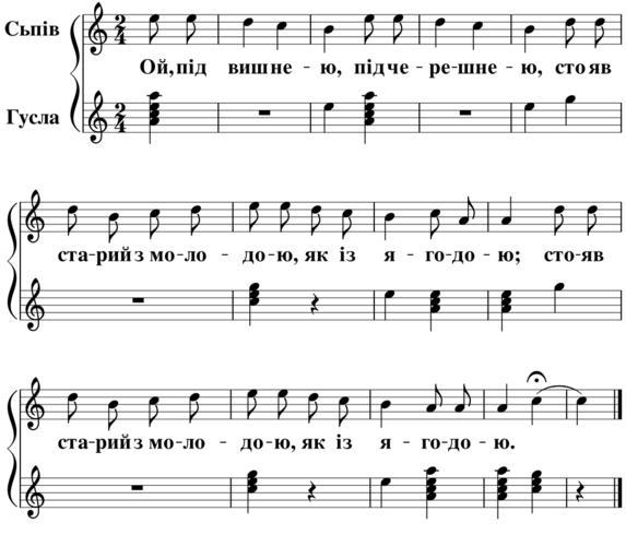 | Keywords: Зоря. Ноти. 1894. 09. 212.svg uk Ілюст ація до статті иколи Лисенка а одні музичні ст ументи на Вк аїнї Суп овід гусел до на одної пісні 1894-05-13 Зо я часопис 1894 09 икола Лисенко other versions Часопис Зо я 1894 09 pdf Hidden background ECECEC; white;color black border 1px grey solid; padding 2px Created by MuseScore <nowiki> < xml version 1 0 encoding UTF-8 > <museScore version 2 06 > <programVersion>2 0 2</programVersion> <programRevision>f51dc11</programRevision> <Score> <LayerTag id 0 tag default ></LayerTag> <currentLayer>0</currentLayer> <Synthesizer> </Synthesizer> <Division>480</Division> <Style> <staffUpperBorder>2</staffUpperBorder> <measureSpacing>1</measureSpacing> <TextStyle> <halign>center</halign> <valign>baseline</valign> <xoffset>0</xoffset> <yoffset>6</yoffset> <offsetType>spatium</offsetType> <name>Lyrics Odd Lines</name> <family>FreeSerif</family> <size>14</size> <bold>1</bold> <sizeIsSpatiumDependent>1</sizeIsSpatiumDependent> </TextStyle> <TextStyle> <halign>right</halign> <valign>center</valign> <offsetType>absolute</offsetType> <name>Instrument Name Long </name> <family>FreeSerif</family> <size>14</size> <bold>1</bold> <sizeIsSpatiumDependent>1</sizeIsSpatiumDependent> </TextStyle> <page-layout> <page-height>759 685</page-height> <page-width>850 394</page-width> <page-margins type even > <left-margin>5 66929</left-margin> <right-margin>5 66929</right-margin> <top-margin>56 6929</top-margin> <bottom-margin>113 386</bottom-margin> </page-margins> <page-margins type odd > <left-margin>5 66929</left-margin> <right-margin>5 66929</right-margin> <top-margin>0</top-margin> <bottom-margin>0</bottom-margin> </page-margins> </page-layout> <Spatium>1 764</Spatium> </Style> <showInvisible>1</showInvisible> <showUnprintable>1</showUnprintable> <showFrames>1</showFrames> <showMargins>0</showMargins> <metaTag name arranger ></metaTag> <metaTag name composer ></metaTag> <metaTag name copyright ></metaTag> <metaTag name creationDate >2015-11-23</metaTag> <metaTag name lyricist ></metaTag> <metaTag name movementNumber ></metaTag> <metaTag name movementTitle ></metaTag> <metaTag name platform >Microsoft Windows</metaTag> <metaTag name poet ></metaTag> <metaTag name source ></metaTag> <metaTag name translator ></metaTag> <metaTag name workNumber ></metaTag> <metaTag name workTitle ></metaTag> <PageList> <Page> <System> </System> <System> </System> <System> </System> </Page> </PageList> <Part> <Staff id 1 > <StaffType group pitched > <name>stdNormal</name> </StaffType> <bracket type 1 span 2 /> </Staff> <trackName>Voice</trackName> <Instrument> <longName>Сьпів</longName> <trackName>Voice</trackName> <minPitchP>36</minPitchP> <maxPitchP>94</maxPitchP> <minPitchA>40</minPitchA> <maxPitchA>79</maxPitchA> <instrumentId>voice vocals</instrumentId> <Articulation> <velocity>100</velocity> <gateTime>100</gateTime> </Articulation> <Articulation name staccatissimo > <velocity>100</velocity> <gateTime>33</gateTime> </Articulation> <Articulation name staccato > <velocity>100</velocity> <gateTime>50</gateTime> </Articulation> <Articulation name portato > <velocity>100</velocity> <gateTime>67</gateTime> </Articulation> <Articulation name tenuto > <velocity>100</velocity> <gateTime>100</gateTime> </Articulation> <Articulation name marcato > <velocity>120</velocity> <gateTime>67</gateTime> </Articulation> <Articulation name sforzato > <velocity>120</velocity> <gateTime>100</gateTime> </Articulation> <Channel> <program value 52 /> <synti>Fluid</synti> </Channel> </Instrument> </Part> <Part> <Staff id 2 > <StaffType group pitched > <name>stdNormal</name> </StaffType> <bracket type -1 span 0 /> </Staff> <trackName>Lute</trackName> <Instrument> <longName>Гусла</longName> <trackName>Lute</trackName> <minPitchP>33</minPitchP> <maxPitchP>79</maxPitchP> <minPitchA>33</minPitchA> <maxPitchA>79</maxPitchA> <instrumentId>pluck lute</instrumentId> <StringData> <frets>13</frets> <string>43</string> <string>48</string> <string>53</string> <string>57</string> <string>62</string> <string>67</string> </StringData> <Articulation> <velocity>100</velocity> <gateTime>100</gateTime> </Articulation> <Articulation name staccatissimo > <velocity>100</velocity> <gateTime>33</gateTime> </Articulation> <Articulation name staccato > <velocity>100</velocity> <gateTime>50</gateTime> </Articulation> <Articulation name portato > <velocity>100</velocity> <gateTime>67</gateTime> </Articulation> <Articulation name tenuto > <velocity>100</velocity> <gateTime>100</gateTime> </Articulation> <Articulation name marcato > <velocity>120</velocity> <gateTime>67</gateTime> </Articulation> <Articulation name sforzato > <velocity>120</velocity> <gateTime>100</gateTime> </Articulation> <Channel> <program value 25 /> <synti>Fluid</synti> </Channel> </Instrument> </Part> <Staff id 1 > <Measure number 1 len 1/4 > <TimeSig> <sigN>2</sigN> <sigD>4</sigD> <showCourtesySig>1</showCourtesySig> </TimeSig> <Tempo> <tempo>1 33333</tempo> <followText>1</followText> <visible>0</visible> <text><sym>unicodeNoteQuarterUp</sym> 80</text> </Tempo> <Chord> <durationType>eighth</durationType> <Lyrics> <text>Ой </text> </Lyrics> <Note> <pitch>76</pitch> <tpc>18</tpc> </Note> </Chord> <Chord> <BeamMode>no</BeamMode> <durationType>eighth</durationType> <Lyrics> <text>під</text> </Lyrics> <Note> <pitch>76</pitch> <tpc>18</tpc> </Note> </Chord> </Measure> <Measure number 2 > <Chord> <durationType>quarter</durationType> <Lyrics> <syllabic>begin</syllabic> <text>виш</text> </Lyrics> <Note> <pitch>74</pitch> <tpc>16</tpc> </Note> </Chord> <Chord> <durationType>quarter</durationType> <Lyrics> <syllabic>middle</syllabic> <text>не</text> </Lyrics> <Note> <pitch>72</pitch> <tpc>14</tpc> </Note> </Chord> </Measure> <Measure number 3 > <Chord> <durationType>quarter</durationType> <Lyrics> <syllabic>end</syllabic> <text>ю </