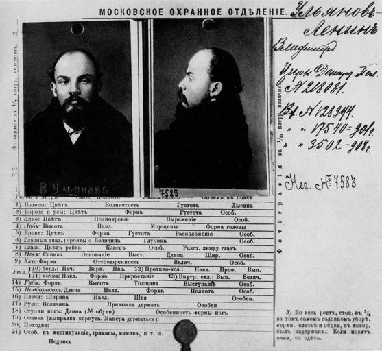 | Keywords: 18951200-lenin-karteikarte-ochrana.jpg en Record card made by tarist secret police Okhrana department Moscow about Vladimir I Lenin during his arrest in connection with the case of the St Petersburg League of Struggle for the Emancipation of the Working Class Not earlier than December 9th /21st/ and not later than December 20th /January 1st 1896/ ru В И Ульянов во в емя а еста по делу пете бу гского Союза бо ьбы за освобождение абочего класса 1895 г не анее 9 21 декаб я - не позднее 20 декаб я 1янва я 1896 г http //prostointeresno com/wp-content/uploads/2013/04/Lenin_-_jizn_v_fotografiyah_6 jpg author 1895-12-21 PD-old <gallery>File Lenin-1895-mugshot jpg</gallery> <gallery>File Lenin-1895-mugshot left png</gallery> Vladimir Lenin in photographs 18951221 Documents of the Russian Empire 1895 |