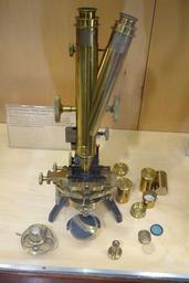 | Keywords: 1895-1900, Whales model binocular compound microscope with objectives and eyepieces, J. Swift & Son, England - Golub Collection of Antique Microscopes - DSC04873.JPG en Microscope in the Golub Collection of Antique Microscopes exhibited at the University of California Berkeley - Berkeley California USA This microscope is old enough so that its design is in the public domain Photography was permitted without restriction 2013-11-15 14 13 23 own Daderot other versions cc-zero Microscopes in the Golub Collection of Antique Microscopes Uploaded with UploadWizard |