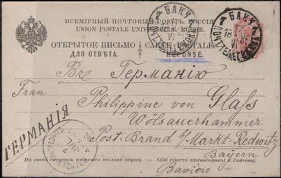 Keywords: Открытое письмоБаку1896.jpg ru Отк ытое письмо из Баку в Ге манию 1896 год Personal collection Processed by A Sdobnikov 1896-06-17 Postal cards of Russia PD-old