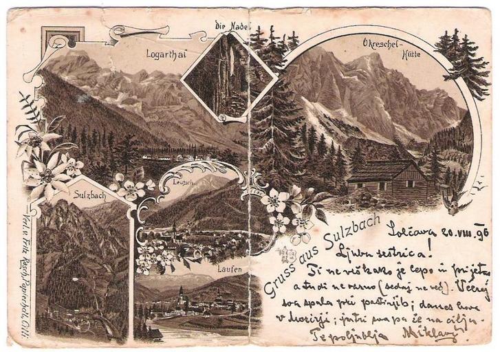 | Keywords: 1896 postcard of Solčava.jpg Postcard of Solčava German exonyms Laufen - Ljubno; Leutsch - Luče; Logarthal - Logar Valley; die Nadel - Igla natural rock obelisk probably incorrect it seems that the drawing depicts Okno v Luknji ; Sulzbach - Solčava http //www razglednice eu/contents/sl/d208_07 html author 1896 assessments 1 PD-Slovenia 1896 postcards of Slovenia Postcards of Solčava Postcards of alpine huts in the Kamnik Savinja Alps Logarska Dolina Postcards of Ljubno ob Savinji Luče Natural windows in Slovenia Edelweiss in art |