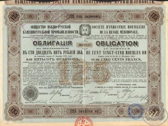 | View Original: | 1897. Облигация. Общество Южно-русской каменноугольной промышленности. 125 рублей.jpg (700x525) | |||