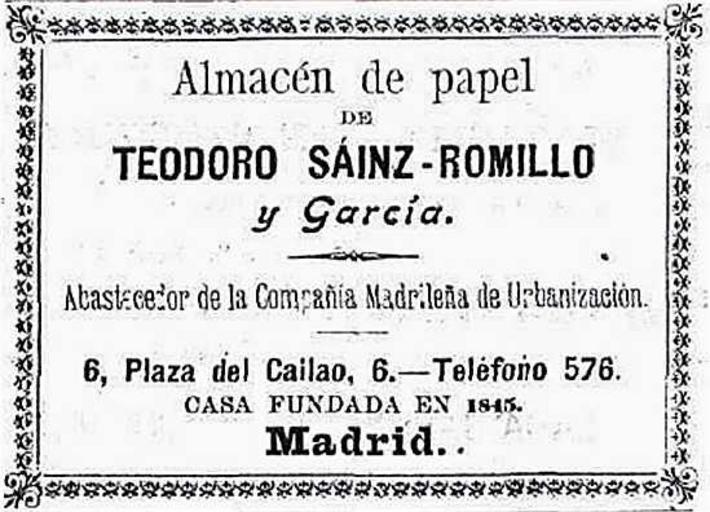 | Keywords: 1897-Almacen-de-papel-plaza.del.Callao-6-Madrid.jpg it Inserzione pubblicitaria su La Ciudad lineal di Madrid del 20 8 1905 - Almacen de papel de Teodoro Sainz Romillo y Garcia - abastacedor de la Compañia Madrileña de Urbanizacion - 6 Plaza del Callao 6 - Telefono 576 Casa fundada en 1845 Madrid La Ciudad lineal Madrid 20 8 1905 n 243 pag 20 Teodoro Sainz-Romillo y Garcia almacen de papel 1905-08-20 PD-old 1897 advertisements in Spain La Ciudad lineal advertisements Casa de comercio Romillo plaza del Callao 6 |
