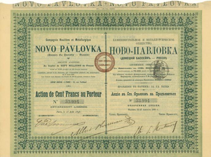 | Keywords: 1898. Акция. Ново-Павловка (Донецкий бассейн).jpg Акция ово-Павловка иусинск Луганская область 1898 http //infodon org ua/postal/281 1898 author PD-RusEmpire Stock certificates from Luhansk Oblast Files uploaded by Andrew Butko from various sources 19th century Images from infodon org ua |