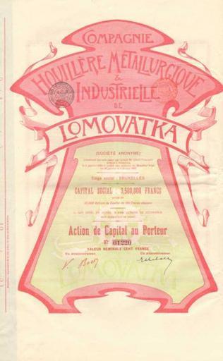 | Keywords: 1899. Companie Hovillere & Industrielle de Lomovatka, Акция в 100 франков.jpg Комания угольных шахт и п омышленных п едп иятий Ломоватки Companie Hovillere Industrielle de Lomovatka Акция в 100 ф анков 1899 г http //infodon org ua/postal/281 1899 author PD-RusEmpire Stock certificates from Luhansk Oblast Files uploaded by Andrew Butko from various sources 19th century Images from infodon org ua | ||||