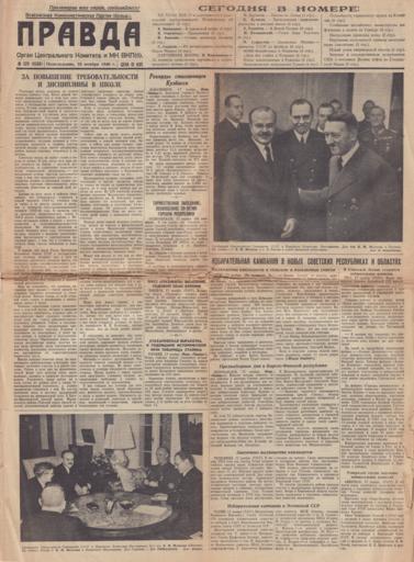 Keywords: Правда 18.11.1940s.png Пе вый лист газеты П авда Экземпля газеты 1940-11-18 газета П авда П авда 18 11 1940 олотов и Гитле png For the text PD-Russia For the pictures PD-old-70 Pravda