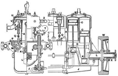 | Keywords: 18-24hp Enfield engine, side-section (Heat Engines, 1913).jpg - A cylinders - B water jackets - C pistons - D inlet camshaft - E exhaust camshaft - F distributor and lubrication pump driving shaft - G high tension distributor - H lubrication pump - J crank chamber oil sump - K big end - L main bearing - M valve tappet rocker arm - N valve tappet - P plate carrying tappet rocker and tappet guide - Q adjustable tappet head - R aluminium supporting arms - S inlet pipe - T exhaust pipe - U hole for second sparking plug - V valves - W flywheel - X clutch spring - Y leather clutch - Z water inflow pipe 18-24hp Enfield engine lubrication system diagram Heat Engines 1913 jpg Cone clutches Petrol engines Vintage car engines Monobloc engines cylinder head Monobloc engines non-monobloc cylinder block |