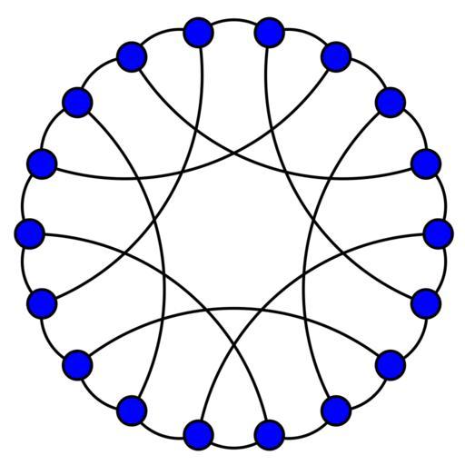 | Keywords: 18-vertex zero-symmetric graph.svg  zero-symmetric graph a cubic graph whose vertices are symmetric but whose edges fall into three different symmetry classes Redrawn in a different style from Fig 1 1 of Coxeter Harold Scott MacDonald; Frucht Roberto; Powers David L 1981 Zero-symmetric graphs Academic Press Inc Harcourt Brace Jovanovich Publishers New York-London ISBN 0-12-194580-4 MR 658666 p  5 2015-01-10 own David Eppstein other versions cc-zero Uploaded with UploadWizard Graphs with 18 vertices 9-fold rotational symmetry |